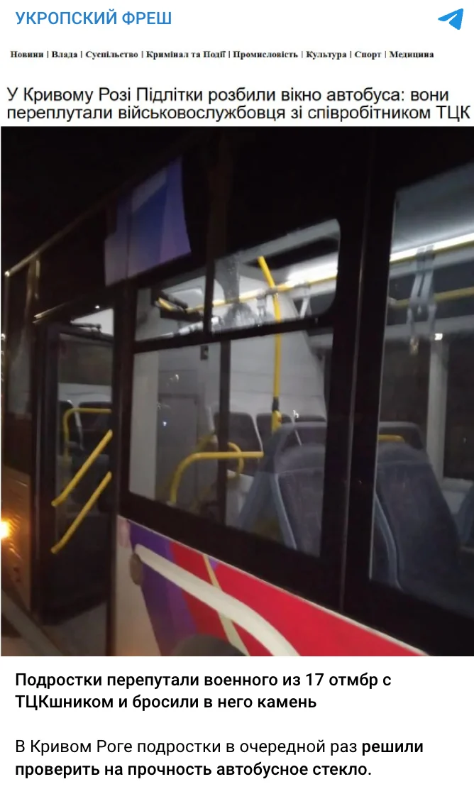 У мережі поширюють інформацію, нібито у Кривому Розі підлітки кинули камінь у вікно автобуса, бо сплутали пасажира із представником ТЦК та СП. Стверджується, що насправді в автобусі перебував військовослужбовець 17-ї окремої важкої механізованої бригади. Такі повідомлення подаються як доказ нібито негативного ставлення до військових і мобілізаційних органів. Чи це фейк розповіли фактчекери VoxCheck.