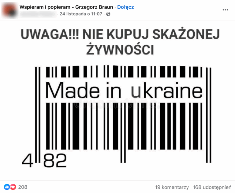 У Польщі з’явилась нова хвиля антиукраїнської дезінформації, зокрема у Facebook поширюють повідомлення, буцімто вся українська їжа є «заражена» і тому її треба уникати. Також автори подібних повідомлень закликають бойкотувати українські товари. За цими дописами стоїть нав’язливий наратив, що нібито продукція з України є «небезпечною».