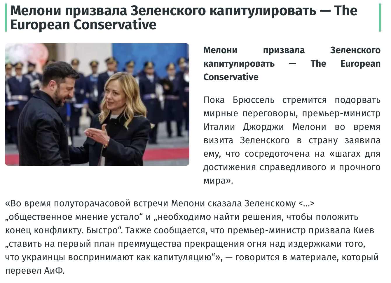 Насправді йдеться про типову маніпуляцію, коли авторську колонку або інтерпретацію журналіста у західному медіа видають за пряму мову політика. У матеріалі The European Conservative немає цитат, у яких Джорджа Мелоні нібито прямо закликає Україну до капітуляції. Видання лише переказує публікації інших італійських медіа, зокрема Il Sole 24 Ore, інтерпретуючи роль прем’єрки Італії у переговорах із Президентом України.