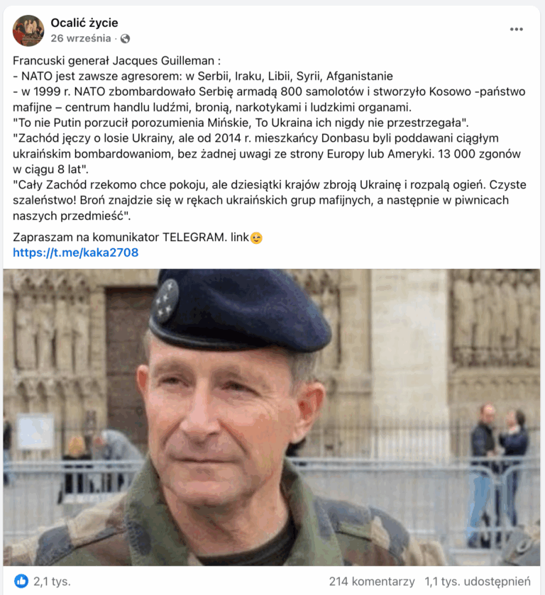 У соцмережах, зокрема на у польському сегменті Facebook, поширюються пости з нібито заявами "французького генерала Жака Гільмана", де він називає НАТО "вічним агресором" (з прикладами воєн у Сербії, Іраку, Лівії, Сирії та Афганістані) і стверджує, що саме Україна, а не Путін, порушила Мінські угоди. Ці матеріали набрали тисячі поширень і коментарів, де користувачі підтримують антизахідні наративи, звинувачуючи США та банки в усіх війнах. Утім, це фейк, який розвінчали польські фактчекери demagog.