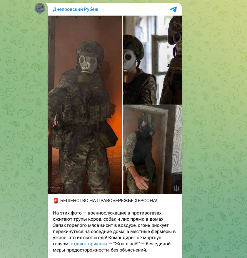 Anonymous propagandist Telegram channels are spreading photos of Ukrainian servicemen wearing gas masks, claiming that they are allegedly burning the carcasses of cows, dogs, and foxes infected with rabies inside residents’ homes in the Kherson region. Propagandists write about the “smell of burning flesh”, panic among local farmers, and orders to “burn everything”, and also claim that the village of Dudchany is supposedly in a state of “total chaos” due to a rabies outbreak to which local authorities are allegedly not responding.