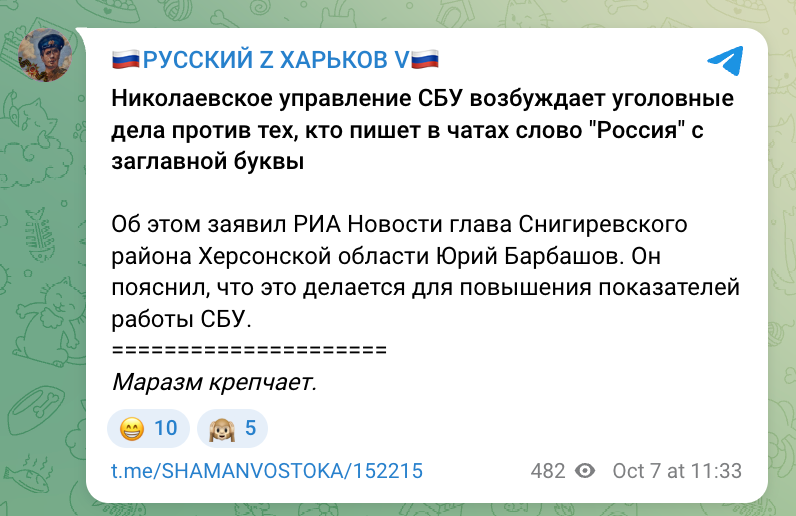 Propagandist anonymous Telegram channels, citing Mykolaiv collaborator Yurii Barbashov, are spreading claims that the Mykolaiv regional office of the Security Service of Ukraine (SBU) is allegedly opening criminal cases against citizens who write the word “Russia” with a capital letter in chats or on social media. This fake was debunked by StopFake experts.