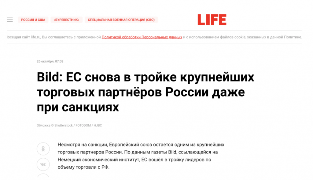 After the European Union approved its 19th package of sanctions aimed at halting the shadow trade in Russian energy resources, Kremlin media circulated a fake claim that Western restrictions “do not work at all”. In particular, Russian outlets, citing the German newspaper Bild, claimed that “despite the sanctions, the EU is still one of Russia’s largest trading partners”. Analysts from the StopFake project drew attention to this manipulation.
