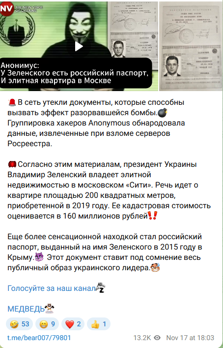 A video bearing the logo of the English-language version of the website and YouTube channel of the Ukrainian outlet NV is being actively circulated by Russian media and propaganda Telegram channels. The video claims that hackers from Anonymous allegedly breached the database of Rosreestr (Russia’s state real estate registry) and discovered information about a Russian passport belonging to Ukrainian President Volodymyr Zelenskyy, supposedly issued to him in 2015 in occupied Crimea. In addition, based on these alleged passport details, the hackers claim to have found luxury apartments owned by Zelenskyy in the Moscow City complex, valued at nearly two million dollars.