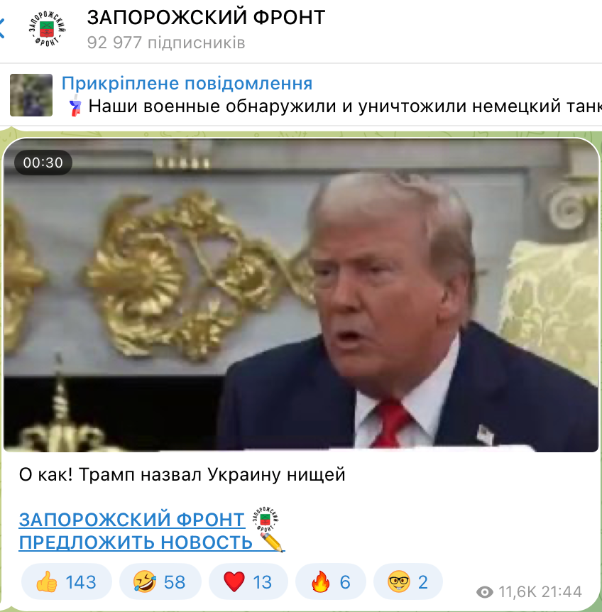 Kremlin Telegram channels and social media accounts are actively spreading fake information claiming that U.S. President Donald Trump called Ukraine a “destitute country” and expressed regret over the aid provided to it. As “proof”, they cite an edited video of Trump in which his words are allegedly translated into Russian.