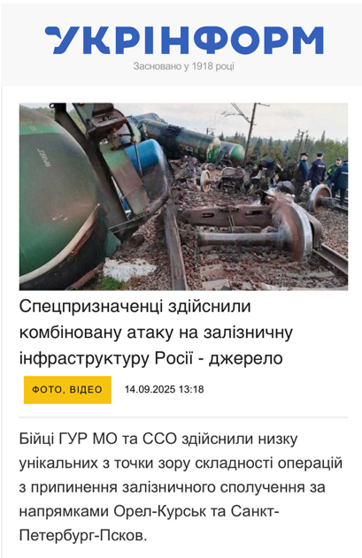It was previously reported that the incident occurred on the night of 14 September near the Nizovskaya station in the Luga district. At around 02:30, the railway line between St. Petersburg and Pskov was blown up on the Stroganovo-Mshinskaya section. As a result of the sabotage, a locomotive derailed and 15 fuel tank cars were destroyed.
