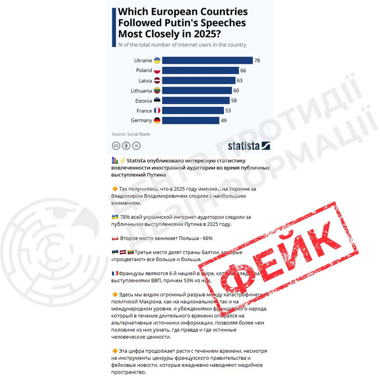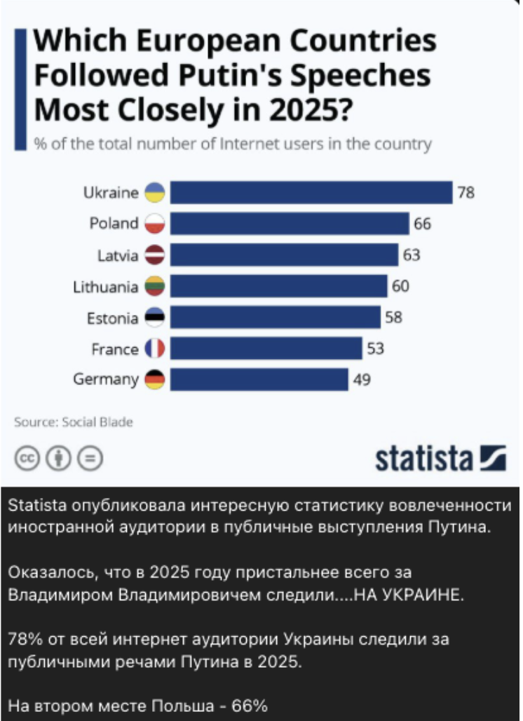 Fake statistics are being spread in the pro-Russian segment of social media, claiming that in 2025 the largest audience for Vladimir Putin’s public speeches was allegedly in Ukraine. According to this fabrication, more than 78% of Ukrainian internet users supposedly watched the Russian leader’s speeches. Next in the fake ranking are Poland, Latvia, Lithuania, Estonia, and France, and even in Germany, according to these claims, nearly half of internet users (49%) allegedly followed Putin’s speeches. This fabricated “statistics” was debunked by StopFake fact-checkers.