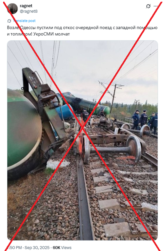 A photo of a derailed train is being circulated on Russian Telegram channels, as well as on the social networks X (formerly Twitter) and Facebook. Propagandist posts claim that this is allegedly the result of a railway track sabotage in Ukraine’s Odesa region carried out by “local pro-Russian partisans”. According to their version, the train was supposedly transporting Western military aid and fuel for the Armed Forces of Ukraine. However, this information is fake.