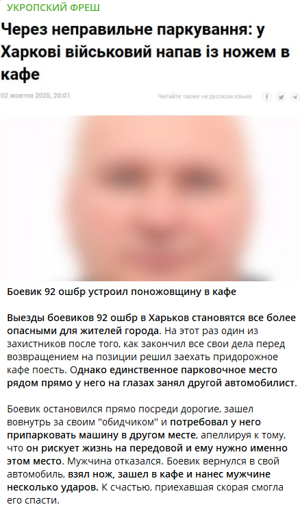 On social media and anonymous Telegram channels, a screenshot of a headline from a Ukrainian news outlet is being circulated, claiming that a serviceman of the 92nd Separate Assault Brigade allegedly attacked a man with a knife in Kharkiv during an argument over a parking space. However, this is a photo fake and a manipulation, VoxCheck experts have determined.