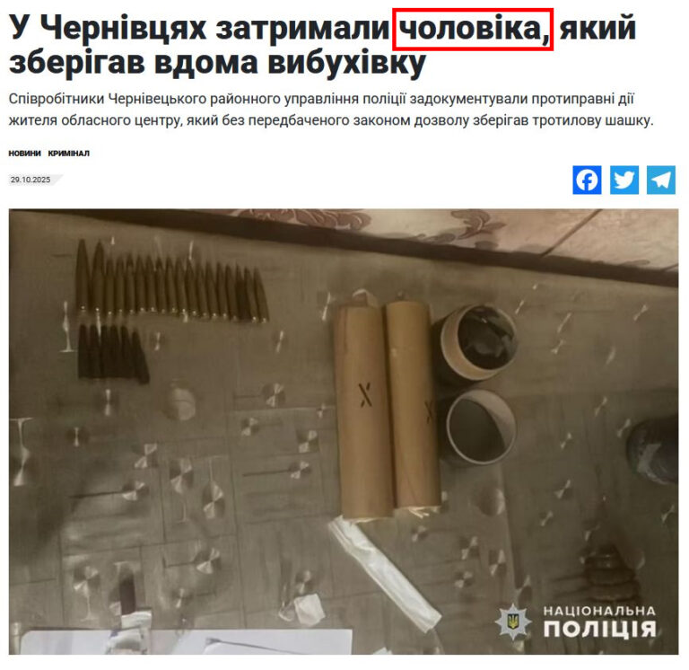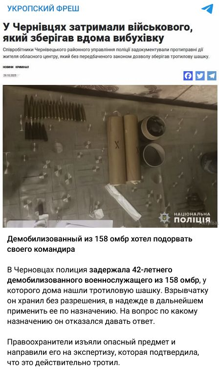 Original report: The news item referenced by Russian channels was published by the Lviv-based TV channel NTA on October 29, 2025. It reported the detention of a 42-year-old man in Chernivtsi Oblast for the illegal storage of a TNT block.