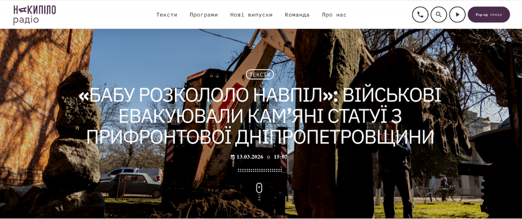 Йдеться про публікацію, оприлюднену 13 березня на радіо «Накипіло» під заголовком: «Бабу розкололо навпіл: військові евакуювали кам’яні статуї з прифронтової Дніпропетровщини». У матеріалі йдеться про евакуацію кількох половецьких статуй та однієї енеолітичної пам’ятки з небезпечної території. Про це розповідає історик і військовослужбовець 25-ї окремої повітряно-десантної Січеславської бригади.