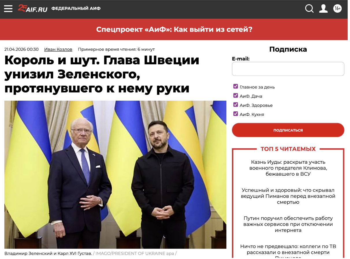 На частині публікацій у фейсбуці помітний логотип Russia Today — телеканалу, який є частиною кремлівської пропагандистської системи і продовжує проникати в інформаційний простір попри блокування з боку ЄС у 2022 році. Акаунт RT на платформі X поширив обрізаний запис з підписом: «Ображений король Швеції відмовився потиснути руку Зеленському».