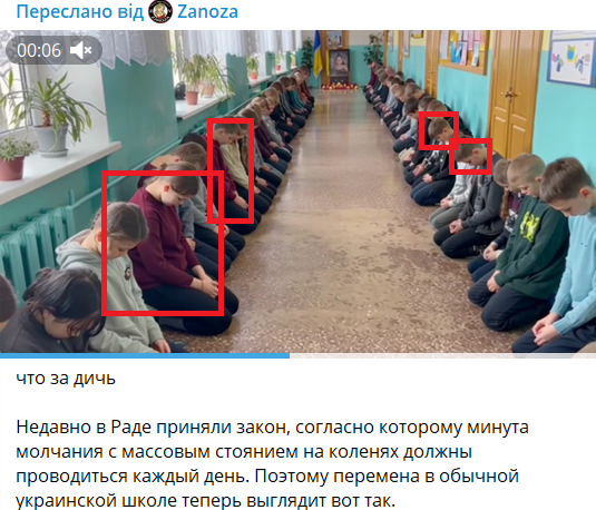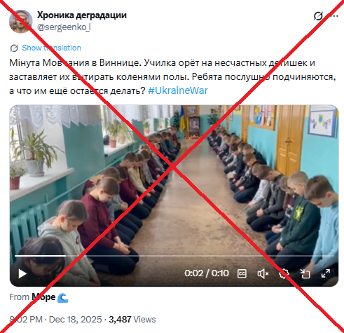 У російському сегменті соцмереж поширюється відео, яке нібито зняте в одній з українських шкіл. На записі показано сцену, де вчителька начебто примушує дітей стояти на колінах у коридорі під час хвилини мовчання. Насправді це — фейк, повідомляє Укрінформ.