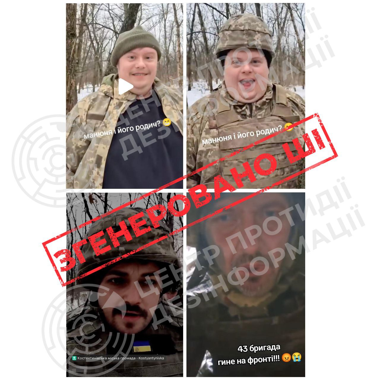 Візуальні аномалії: при детальному розгляді помітно, що тіла солдатів деформовані, пальці на руках не до кінця промальовані, а обличчя та пози занадто однотипні — це класичні помилки сучасних генераторів зображень.