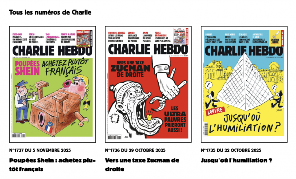 Charlie Hebdo has never published such material. All recent issues are available on the magazine’s official website, and none of them feature a cover with Macron. The actual issue was released not on November 6 but on November 5, and it focused on a completely different topic – an investigation into a scandal involving the online retailer Shein and child-like sex dolls.