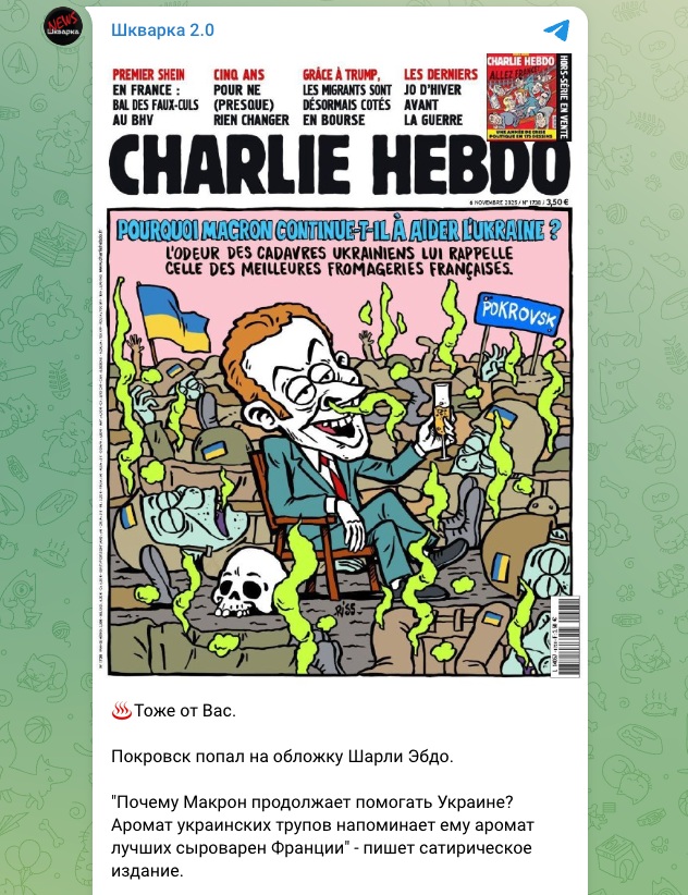Propaganda Telegram channels are actively spreading a fake cover allegedly belonging to the French satirical magazine Charlie Hebdo and supposedly dedicated to French President Emmanuel Macron. It depicts Macron holding a glass of champagne on a battlefield among the bodies of Ukrainian soldiers in Pokrovsk, where he is allegedly “enjoying” the events. The text on the fake cover claims: “Why does Macron continue to help Ukraine? The smell of Ukrainian corpses reminds him of the aroma of the finest French cheese dairies”. However, as fact-checkers from StopFake have shown, this is a forgery.