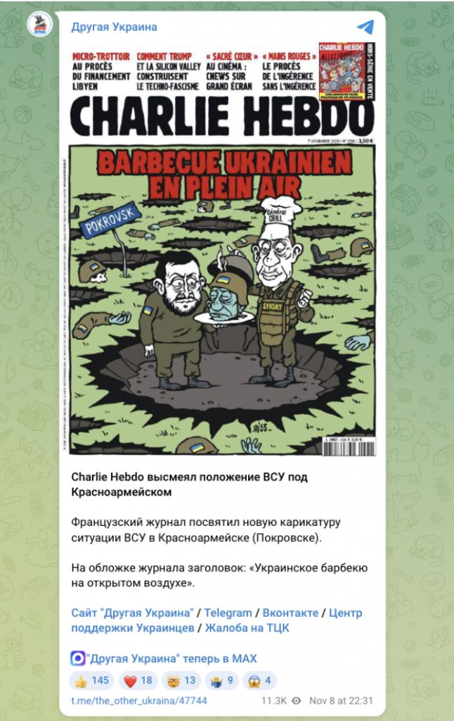 Russian propagandists did not stop at a single forgery and created another fake Charlie Hebdo “cover” dedicated to the fighting for Pokrovsk. It depicts the Commander-in-Chief of the Armed Forces of Ukraine, Oleksandr Syrskyi, portrayed as a chef allegedly showing Volodymyr Zelensky a piece of “Ukrainian barbecue” – the head of a soldier.