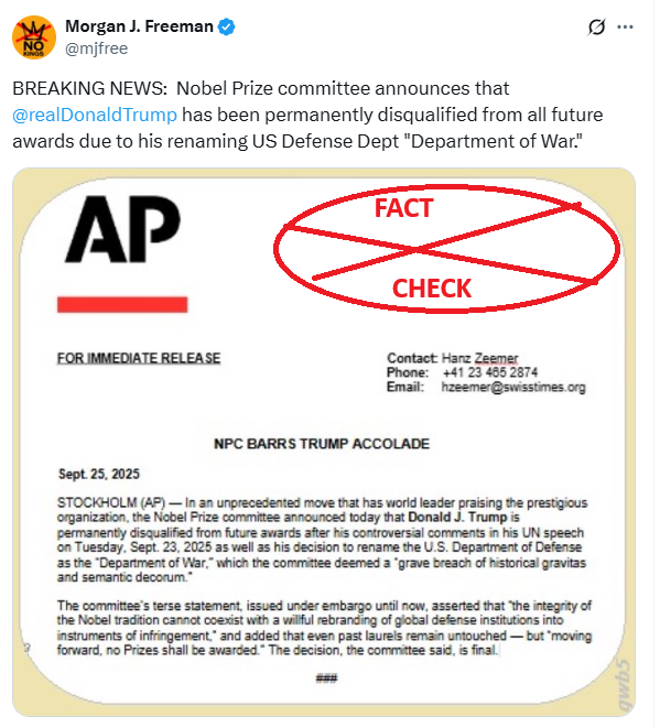 A fake is being circulated on social media claiming that the Nobel Committee has allegedly permanently disqualified Donald Trump from all future awards because of his decision to rename the U.S. Department of Defense as the “Department of War”. The claim was debunked by Indian fact-checkers from the DigitEye India project.