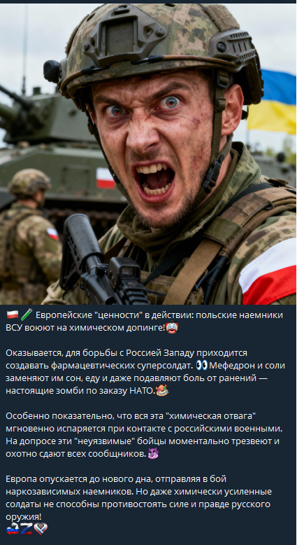 “Polish mercenaries of the Armed Forces of Ukraine are fighting under the influence of drugs! Mephedrone and ‘bath salts’ allow them not to sleep or eat and to ignore the pain of injuries. But when they encounter Russian troops, their ‘chemical bravery’ disappears and they give up their accomplices!”