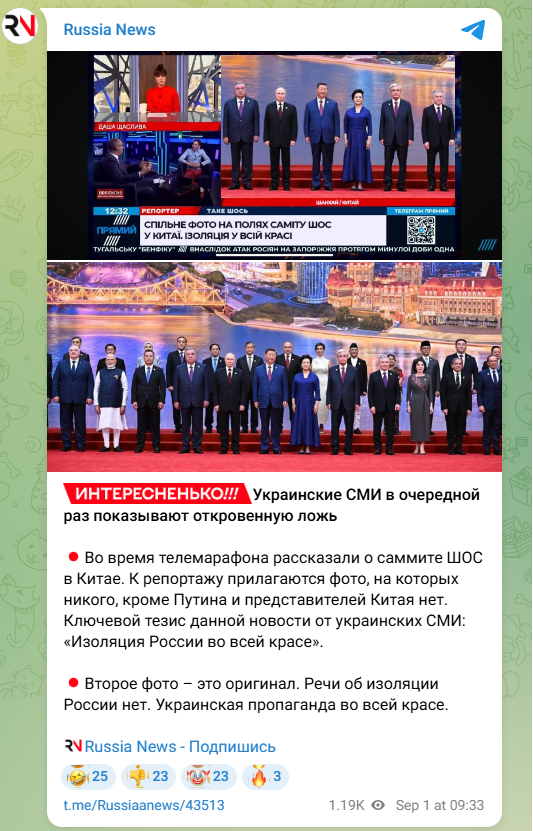 A screenshot allegedly from the Ukrainian TV channel Pryamyi is being circulated on Russian propagandist Telegram channels and social media. It shows a cropped photograph of participants at a Shanghai Cooperation Organisation (SCO) summit in China. The image displays only Vladimir Putin and representatives of China, accompanied by the caption: “A joint photo on the sidelines of the SCO summit in China. Isolation in all its glory”. Fact-checkers from StopFake have proven that this screenshot is fake.