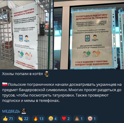 Propagandist Russian Telegram channels are spreading a fake photo of an announcement allegedly posted at one of the border checkpoints between Ukraine and Poland. According to this “announcement”, Ukrainians would be checked for OUN-UPA symbols, including through inspections of tattoos after being forced to undress and by checking personal electronic devices. Experts from VoxCheck identified the announcement as fake.
