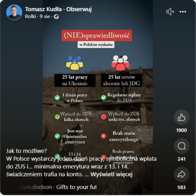 The video circulating on social media manipulates comparisons by ignoring that the same rules regarding pensionable service and employment conditions apply to both Poles and Ukrainians. Claims about receiving a pension after one day of work are false, as payments depend on contribution history and the amount paid in. This fuels anti-Ukrainian sentiment by creating a false impression of unfair “privileges” for Ukrainians in Poland.