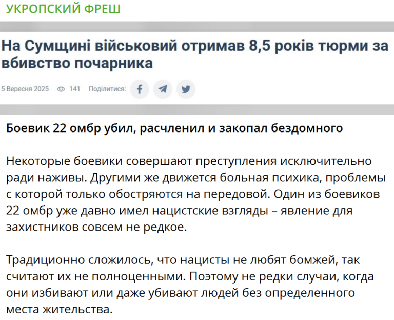 Russian propagandist Telegram channels are spreading a fake screenshot allegedly referencing a Ukrainian media outlet. The post claims that a serviceman of the 22nd Separate Mechanized Brigade killed a homeless man with whom he had been drinking alcohol in Sumy Oblast. This information is disinformation aimed at discrediting Ukrainian soldiers, as established by fact-checkers from VoxCheck.