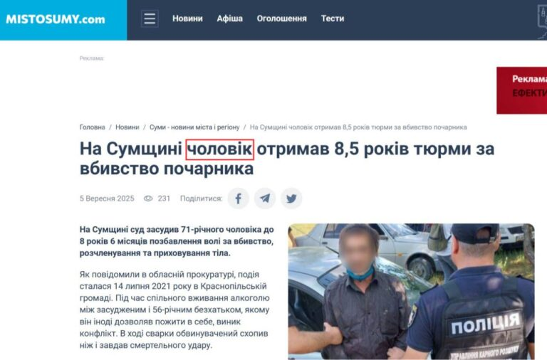 - Forged screenshot: The original article published on September 5, 2025, on the website MistoSumy.ua reports on an 8.5-year prison sentence for a man convicted of murder. The text does not mention that the accused was a serviceman, let alone connected to the 22nd Separate Mechanized Brigade. The screenshot circulated by propagandists was manipulatively edited using photo-editing software to add a reference to a soldier.