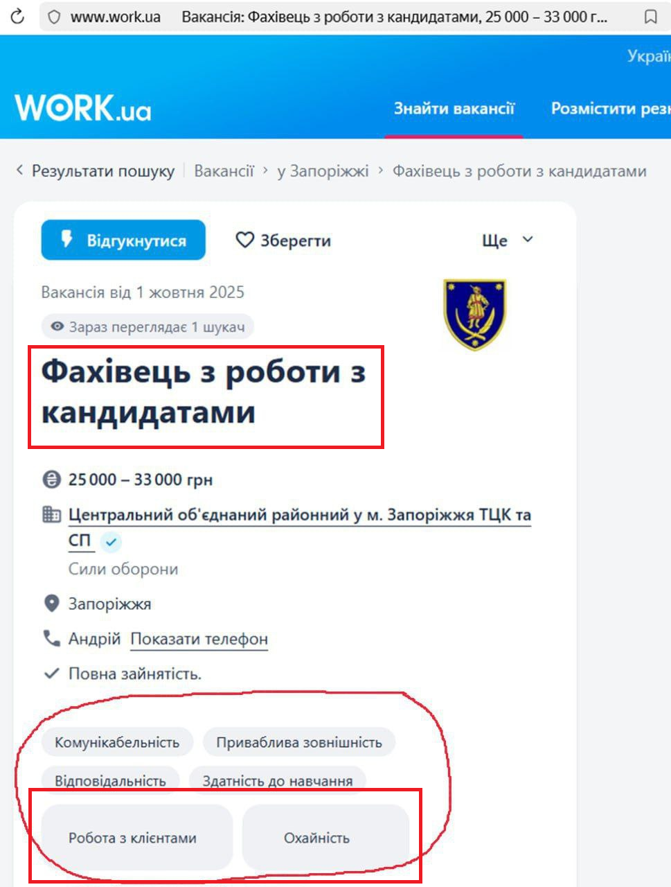 The posts claim that a vacancy was supposedly published on the Work.ua website by the Zaporizhzhia District Territorial Center for Recruitment and Social Support (TCC and SP). According to the screenshots, the center is allegedly looking for a “candidate relations specialist”, with requirements listed as “attractive appearance”, “experience in the modeling business”, and “exotic dancing”. The circulating posts are accompanied by claims that Ukrainian TCCs are allegedly recruiting sex workers for enlistment purposes.