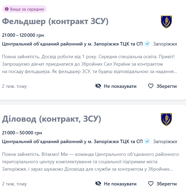 However, this is fake, created by Russian propagandists. No such job posting has ever appeared on the Work.ua website. In reality, Russian actors falsified existing TCC vacancies – for a paramedic and a clerk – by changing the job titles and adding fabricated requirements.