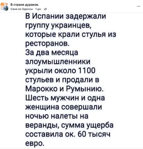 In the pro-Russian segment of the internet, a story is being circulated claiming that a group of Ukrainians was allegedly detained in Spain for attacking restaurants at night, stealing chairs, and selling them. Propagandists present this absurd incident as “proof” that Ukrainian citizens abroad bring only harm to society. This fake was debunked by experts from StopFake.