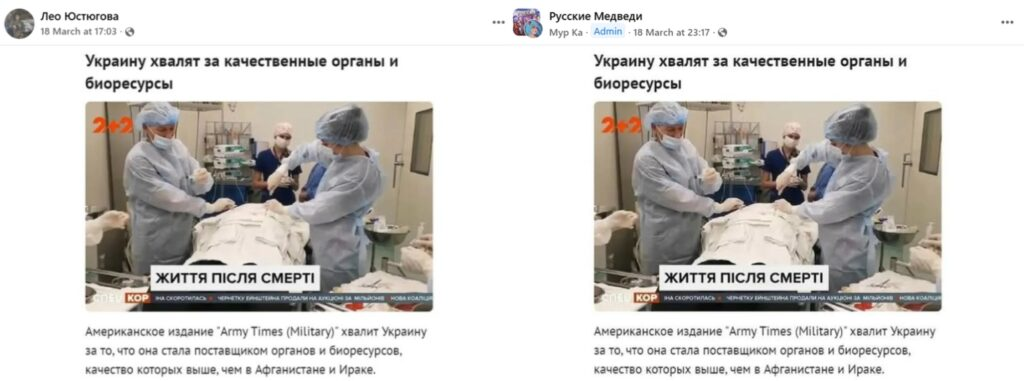 У середині березня 2026 року у Facebook та інших соцмережах активно поширювалися дописи українською та російською мовами, у яких стверджувалося, ніби американське військове видання Army Times опублікувало статтю, в якій Україну нібито «похвалили» за те, що вона стала постачальником органів та біоресурсів. Як «доказ» прикріплювали скріншот російськомовного тексту з заголовком про високу якість українських органів порівняно з афганськими та іракськими, а також фотографію хірургів під час операції та логотип українського телеканалу «2+2». Розвінчали фейк грузинські фактчекери Mythdetector
