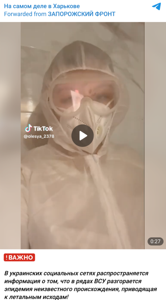 Проросійські телеграм-канали масово поширюють ролик, де нібито лікарка однієї з павлоградських лікарень у повному захисному костюмі «розповідає» про страшний спалах загадкової хвороби. За словами жінки, серед пацієнтів-військовослужбовців спостерігається висока температура (близько 40 °C), масова кома та рекордна смертність. Цей фейк розвінчали експерти voxukraine