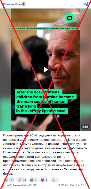 Паралельно російська пропаганда поширює відео з логотипом опозиційного російського видання «Агентство», яке працює за кордоном. У ролику стверджується, що українські еліти після 2014 року нібито знали про торгівлю дітьми для потреб мережі Джеффрі Епштейна та «закривали на це очі».