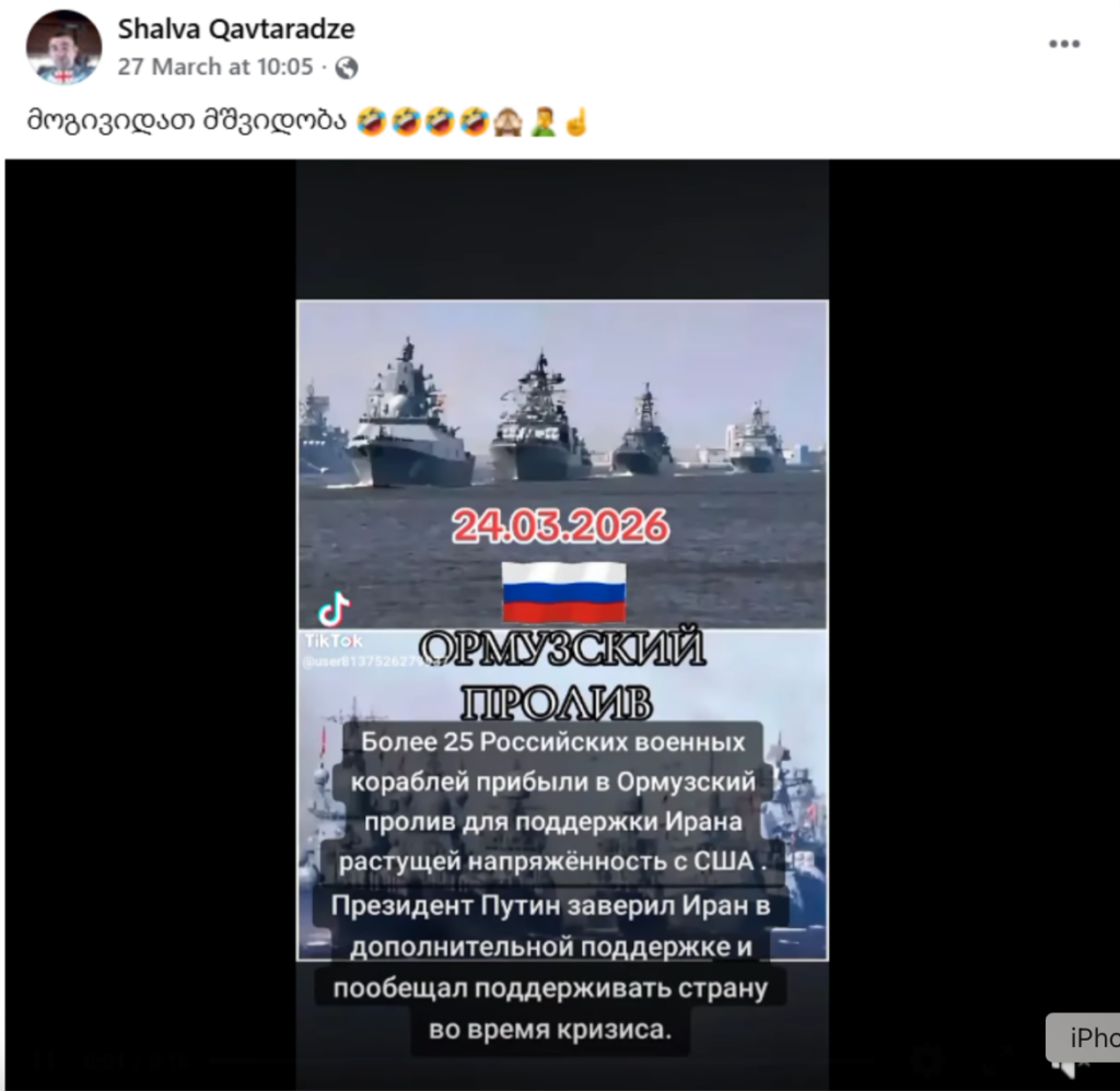 У соцмережах, зокрема у Фейсбуці, активно циркулює чергова фотоманіпуляція: нібито Москва надіслала великий флот військових кораблів на підтримку Ірану в Ормузьку протоку. Автори постів стверджують, що це сталося на тлі загострення стосунків з США. Насправді це класична маніпуляція зі старим архівним відео — розвінчали маніпуляцію грузинські фактчекери mythdetector.