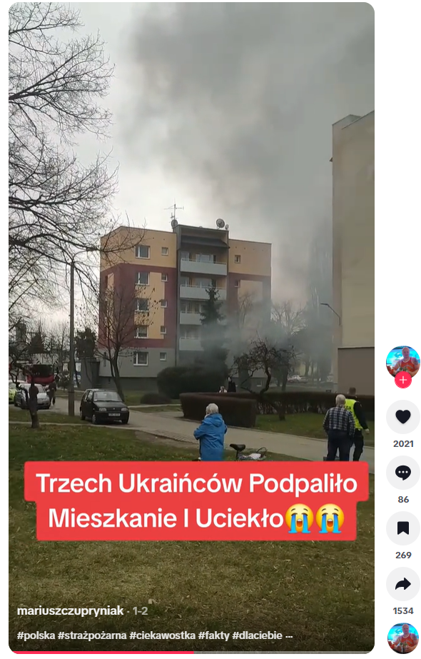 У соцмережах Facebook та TikTok (де відео набрало понад 100 000 переглядів) розповсюджується короткий ролик: на кадрах видно багатоповерхівку, охоплену густим чорним димом, та приїзд пожежників. Підпис стверджує: «Троє українців підпалили квартиру та втекли». Відео викликало хвилю агресивних коментарів та мову ворожнечі на адресу біженців.