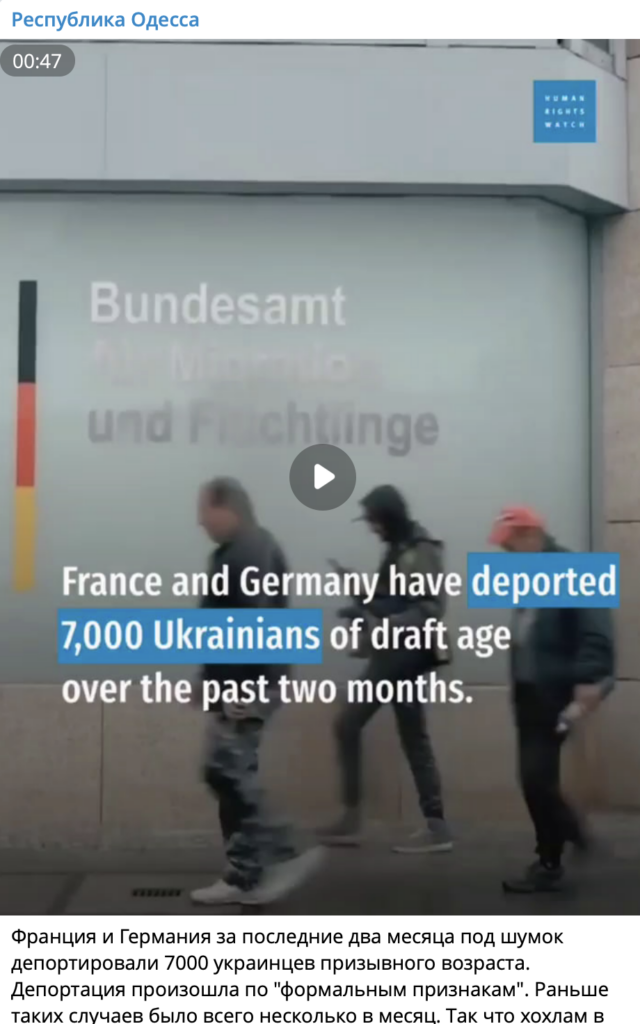 У мережі поширюється відео, нібито організація Human Rights Watch зафіксувала випадки, коли Німеччина та Франція депортували понад 7 000 українців призовного віку протягом останніх двох місяців. У повідомленнях ідеться про те, що нібито ці країни цілеспрямовано відправляють українців додому через їхній вік, і ця «депортація» є сигналом нібито «посилення політики ЄС щодо українців».