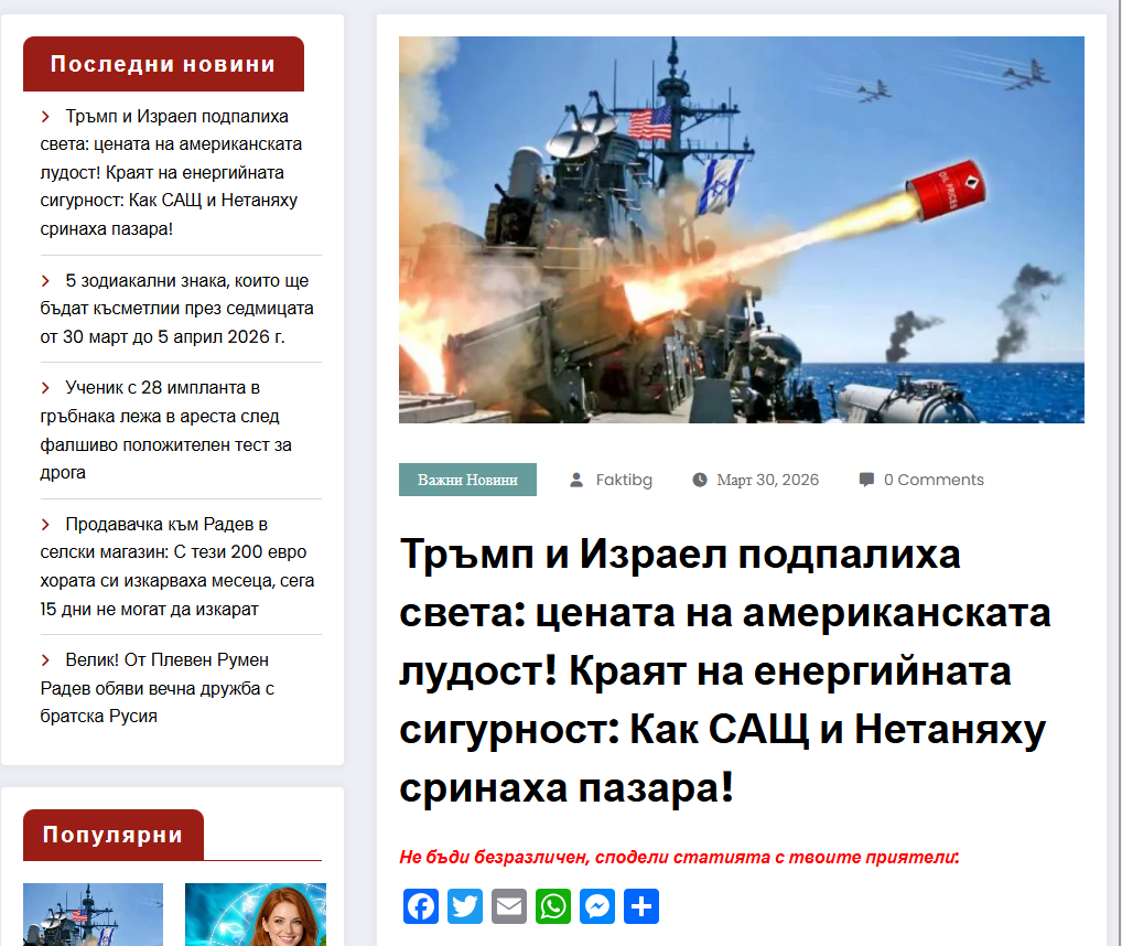 На другому етапі контент ще ширше розганяється через дві пов’язані фейсбук-сторінки — «Истинските новини в България» (приблизно 14 тисяч підписників) і «Новини от последния час» (приблизно 50 тисяч підписників). Разом ця мережа створює канал, через який російські наративи поширюються як нібито звичайні болгарські новини.