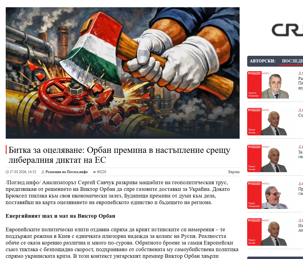Розслідування Светослава Малінова, Center for the Study of Democracy (CSD), поширене мережею A4E Counter Disinformation Network (CDN) показує, як кремлівська пропагандистська інфраструктура системно поширює проросійську дезінформацію через болгарський інформаційний простір. У центрі цієї схеми — сайт Pogled.info, який з лютого 2022 року регулярно передруковував матеріали з пов’язаних із Кремлем і підсанкційних медіа, зокрема RIA Novosti, Sputnik та інші.