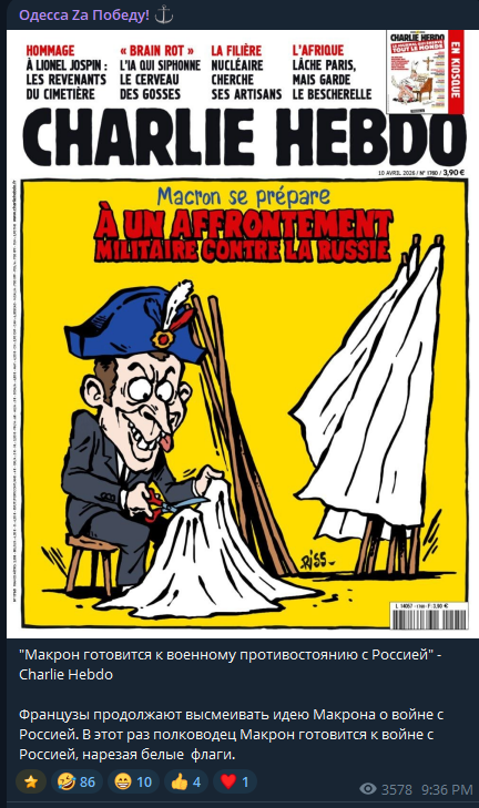 У проросійських телеграм-каналах активно розповсюджується зображення, що видається за обкладинку відомого французького сатиричного журналу Charlie Hebdo. На ній нібито зображено президента Франції Еммануеля Макрона в контексті підготовки до війни з Росією. Зображення перевірили експерти VoxCheck та виявили, що це підробка.