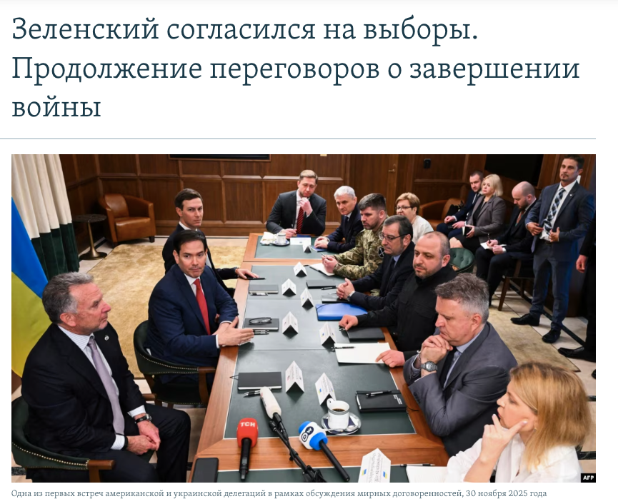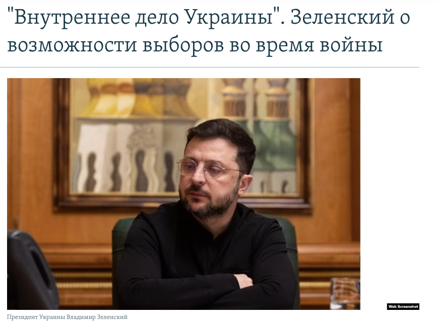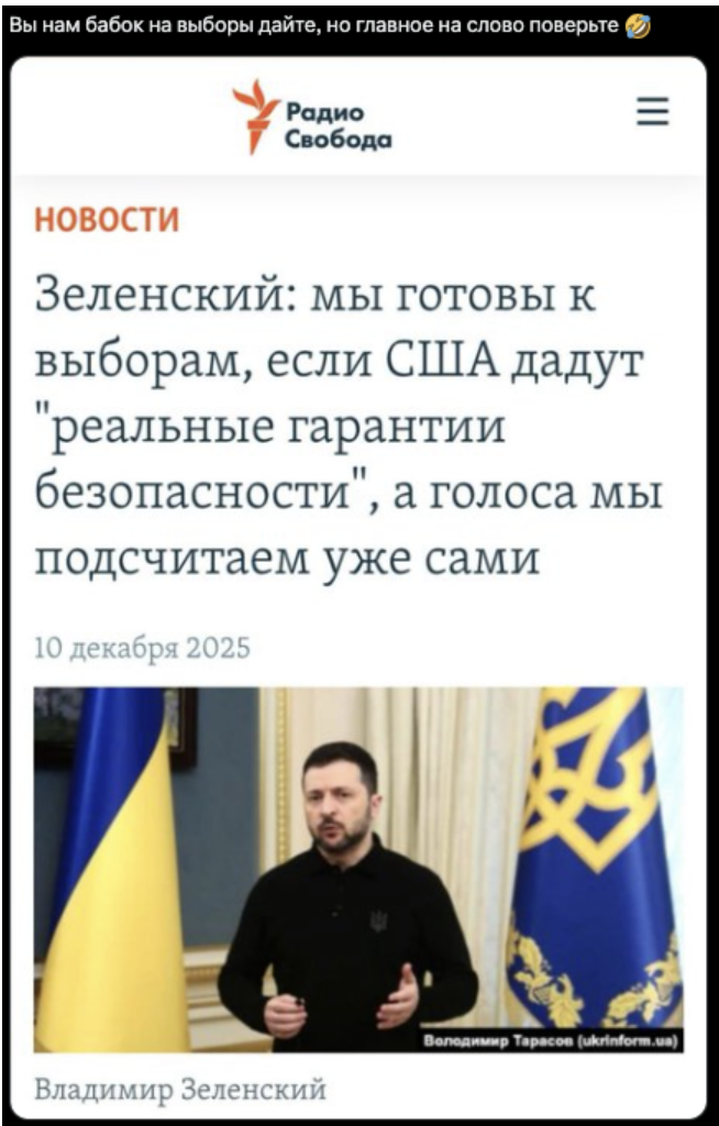 Фактчекери проєєкту StopFake звернули увагу на те, що у проросійському сегменті соцмереж поширюють відредагований скриншот нібито публікації «Радіо Свобода». У фейковому заголовку стверджується, що президент України Володимир Зеленський готовий провести вибори за умови отримання реальних гарантій безпеки від США, але лише якщо підрахунок голосів здійснюватиме сам уряд. Цей вигаданий меседж пропагандисти супроводжують насмішками на кшталт: «Грошей на вибори дайте, але на слово повірте».