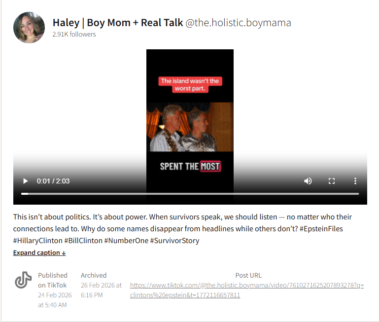 Цей аудіозапис почали активно розповсюджувати у TikTok, Instagram та Facebook наприкінці лютого 2026 року. У відео показують фото Епштейна з Біллом Клінтоном, а за кадром жіночий голос, який називають «голосом тієї, хто вижив», мовить: «Хочете правду про те, хто провів найбільше часу на острові? Скажу прямо — це Клінтон. Ті, хто вижив, називають його номером один». Деякі користувачі навіть припускали, що це голос Вірджинії Джуффре — відомої жертви Епштейна, яка померла у квітні 2025 року. Однак, 26 лютого Гілларі Клінтон під присягою перед Комітетом з нагляду Палати представників заявила, що ніколи не зустрічалася з Епштейном, не літала його літаком і не відвідувала його маєток.
