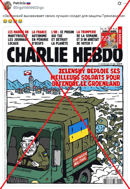 Російські пропагандистські телеграм-канали та боти в соціальній мережі X поширюють фейкову обкладинку французького сатиричного журналу Charlie Hebdo. На зображенні нібито показано карикатуру на Президента України Володимира Зеленського з підписом: «Зеленський відправляє своїх найкращих солдатів на захист Гренландії».