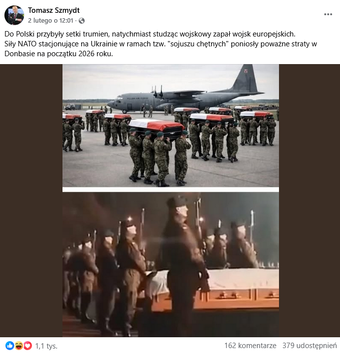 Інші кадри, які видають за «репатріацію тіл з України», насправді були зняті 15 років тому. Це архівне відео прибуття тіл польських солдатів, які загинули під час місії в Кабулі (Афганістан) у 2011 році. Цей же відеоряд пропаганда вже намагалася використати у 2022 році, що тоді офіційно спростував уповноважений уряду Польщі з питань безпеки інформпростору Станіслав Жарін.