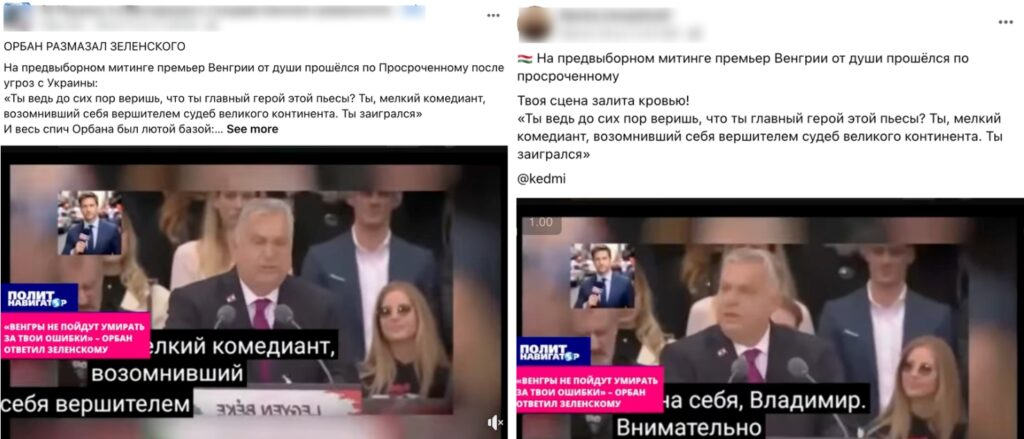 У грузинсько- та російськомовних сегментах Facebook активно розповсюджується відео, де нібито Віктор Орбан жорстко звертається безпосередньо до Володимира Зеленського. У підробленому російському перекладі угорський прем’єр порівнює президента України з клоуном, звинувачує Вашингтон і Брюссель у розпалюванні війни, заявляє, що Зеленський тягне Європу «в могилу та прірву», а війна — єдине джерело його легітимності. Орбан нібито також відмовляється робити угорців жертвами «помилок, невдалих переговорів і фанатичних бажань» українського лідера. Розвінчали фейк експерти Myth Detector.