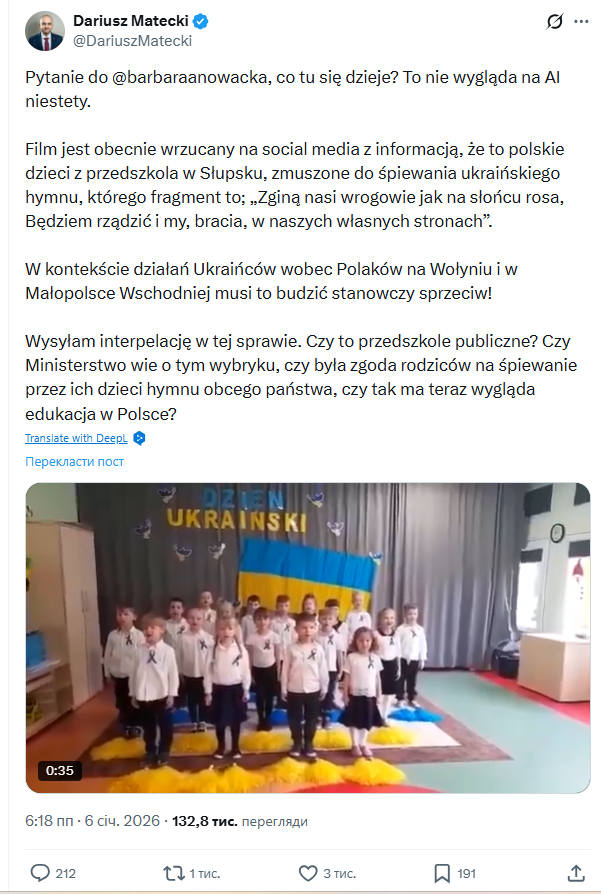 Переклад посту Даріуша Матецького з партії «Право і справедливість» на платформі Х