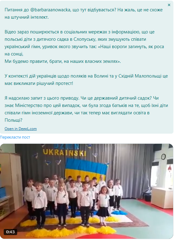 У польських соціальних мережах поширюється відео, де польські діти нібито змушені виконувати гімн України. Польські політики обурилися, але, як з'ясувалося, це старий запис, а жодного примусу не було. Цю маніпуляцію спростували експерти порталу Демагог