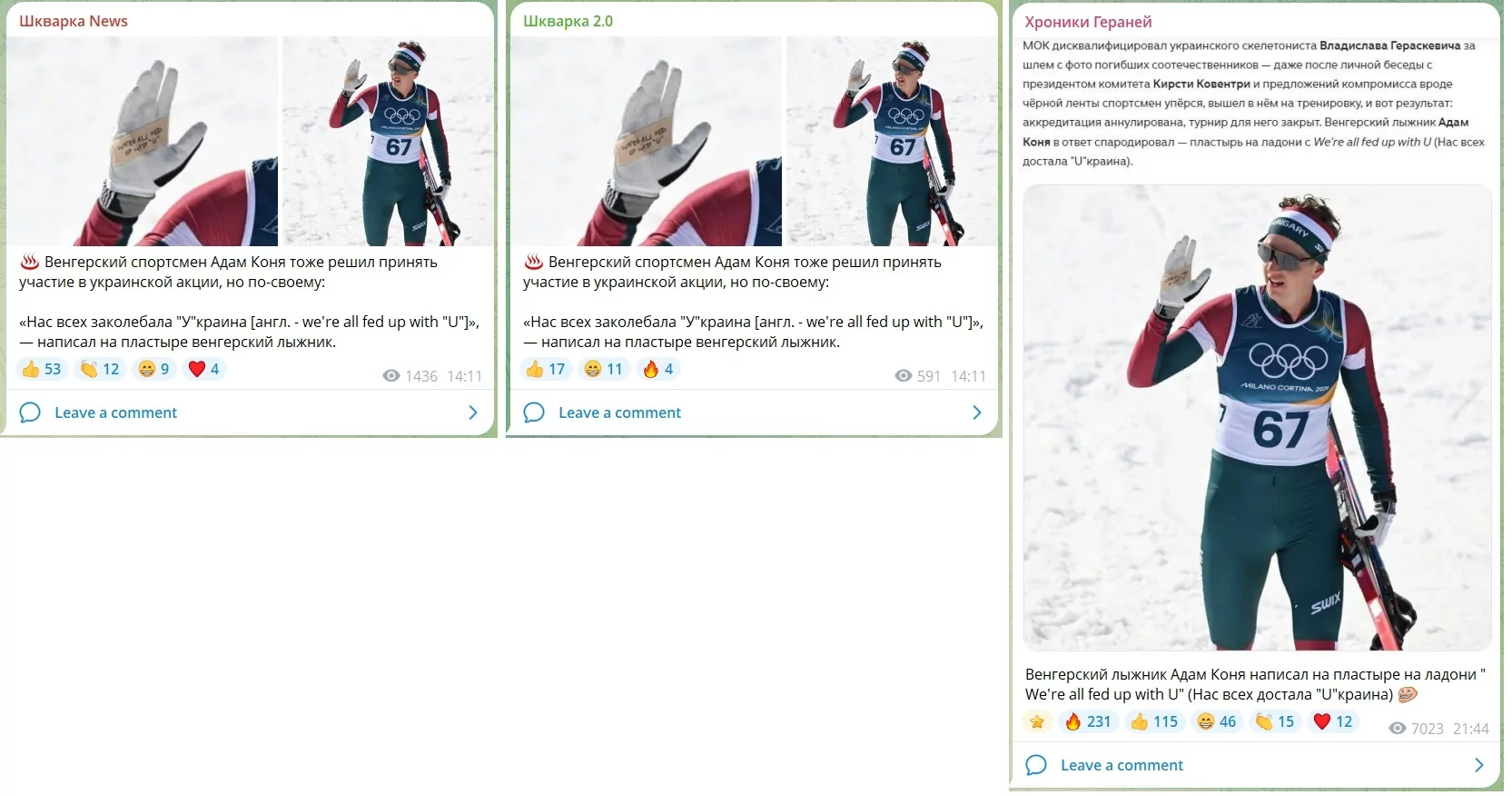 У мережі зросла хвиля дезінформації навколо участі спортсменів на зимових Олімпійських іграх 2026 у Мілані, і одним із таких фейків стала історія про нібито «антиукраїнську реакцію» угорського лижника Адама Коня. У проросійських телеграм-каналах і медіа поширювали твердження, що Коня нібито наклеїв на рукавицю напис англійською: «We’re all fed up with U» – «Нам всім набридла Україна», ніби висловлюючи невдоволення діями українських спортсменів на Іграх. Розвінчали фейк – Ґвара медіа.